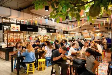 A food court is a common area within a facility, like a shopping mall or airport, that houses multiple food vendors, offering a range of cuisines and a shared dining area for customers.